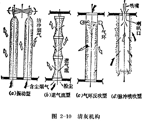 清灰機構如圖(a)振打型、(b)逆流反吹型-(c)氣環反吹型和(d)脈沖噴吹型。振打型是利用機械振動濾袋,將除塵布袋上的粉塵振打下來。逆流反吹型是利用與含塵氣流反方向流動的氣流將濾袋上的粉塵吹落下來。氣環反吹型是利用具有噴射壓縮空氣隙縫的氣環,沿圓筒形濾袋外側上下移動,把濾袋上的粉塵吹落下來。脈沖噴吹型是利用脈沖控制儀每隔30-60秒將壓縮空氣從噴嘴經過喇叭口噴入濾袋一次(每次噴吹 0.1秒)。含塵氣流是由濾袋四周進入濾袋中,經濾袋過濾后的氣體從濾袋內通過喇叭口排出。清灰時,壓縮空氣突然噴人使連袋受到向外撐的振動力及向外的噴射氣流,把濾袋_L的粉塵振吹下來。