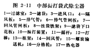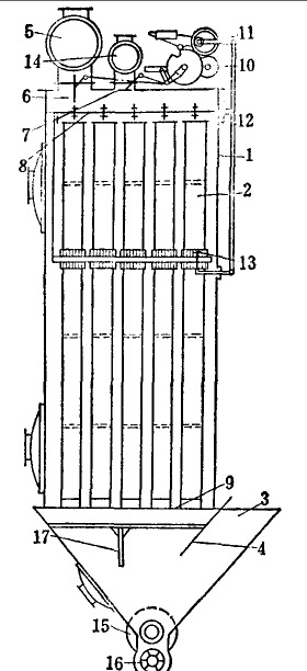 中部振打袋式除塵器是由振打清灰裝置、濾袋、過濾室(箱體)、集塵斗、進出口風管及螺旋輸送機等主要部分所組成。它的構造如圖。