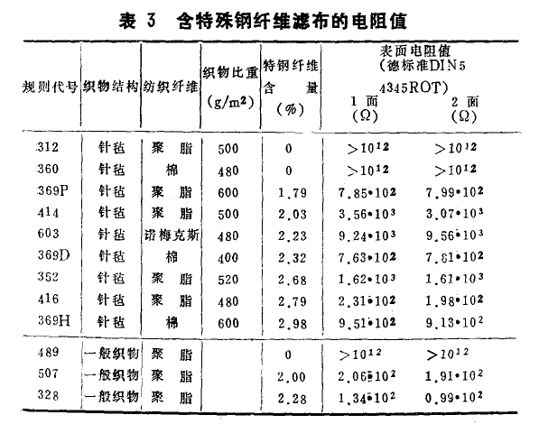 表3列出了各種含特殊綱纖維或不含特殊鋼纖維濾料的表面電阻值,該值是根據德國工業標準54345測定的.不同面積比重的織物纖維制成的濾料結構,加入不銹鋼纖維后,使其電阻值保持在很低的水平.當特殊鋼纖維含量約占2%時,無論使用什么織物纖維或濾料結構,表面電阻都在102-102電阻之間.該值低于波恩職業協會確定的109電阻安全限值.