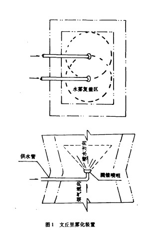 文丘里除塵得的噴水射流是兩個半重疊圈錐形(如圖l中水霧復蓋區).煙道截面是矩形.在煙道截面的四角不能被水霧復蓋。水霧的充滿度差,除塵效果不佳。